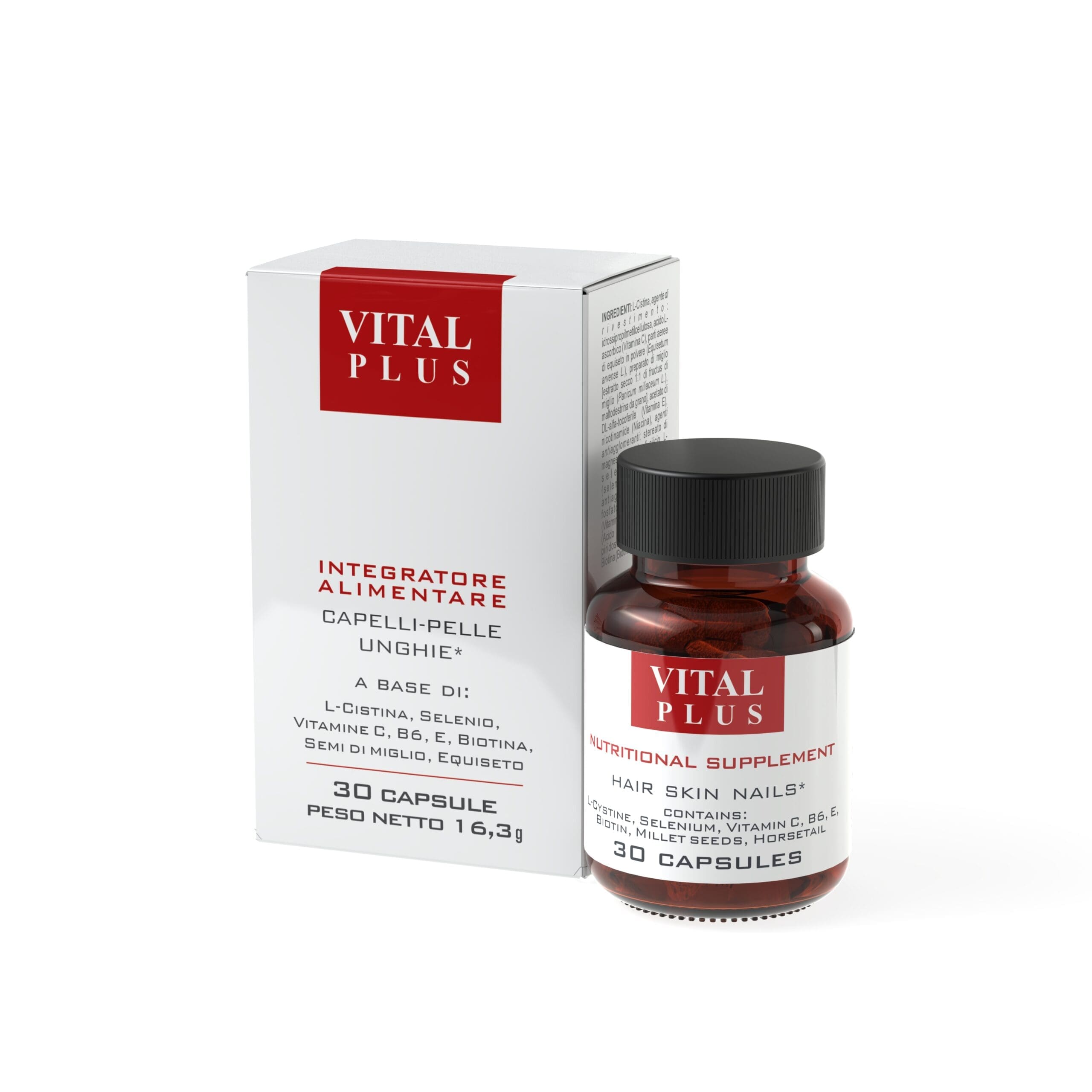 FUNCTION: multivitamin dietary supplement with vitamins a, e, c, b6, l-cystine, selenium, millet, biotin and niacin. important multifunctional and antioxidant substances essential to protect the skin and the hair from degenerative processes and aging skin. the capsules contain the most important b vitamins that are involved in the processes of growth, maintenance and reproduction of the physiological hair cycle. in addition, millet extract and cystine have a restructuring action that is essential for the biosynthesis of keratin. the presence of niacin and biotin are then useful for normalising and preventing skin desquamation, facilitating keratolytic normalisation.
